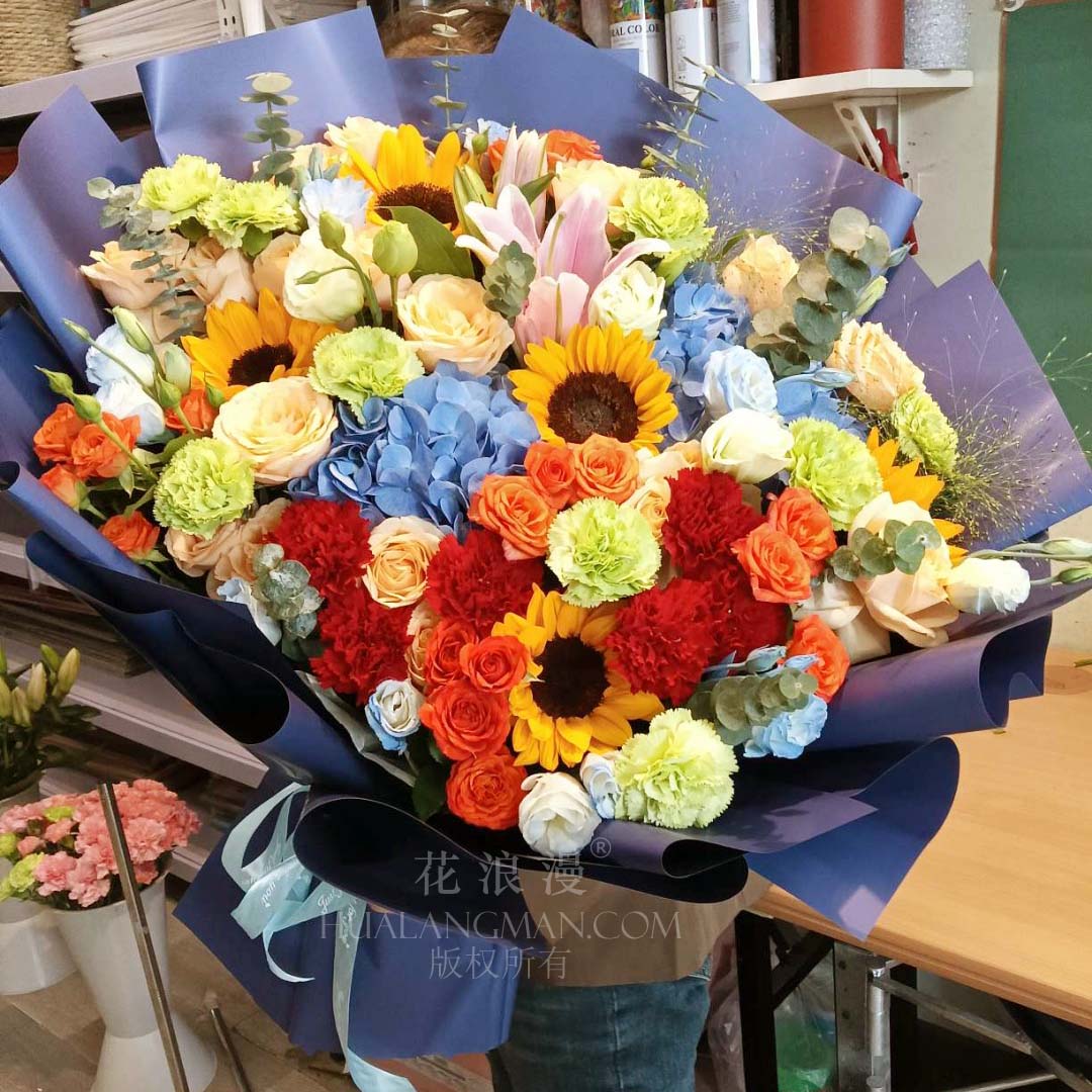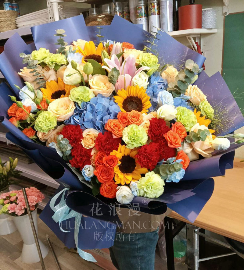 5枝向日葵,2枝蓝绣球,19枝香槟玫瑰,3枝多头绿桔梗,橙色多头泡泡,6枝多头白桔梗(染浅蓝色),6枝红色康乃馨,1枝粉百合,尤加利如图包装